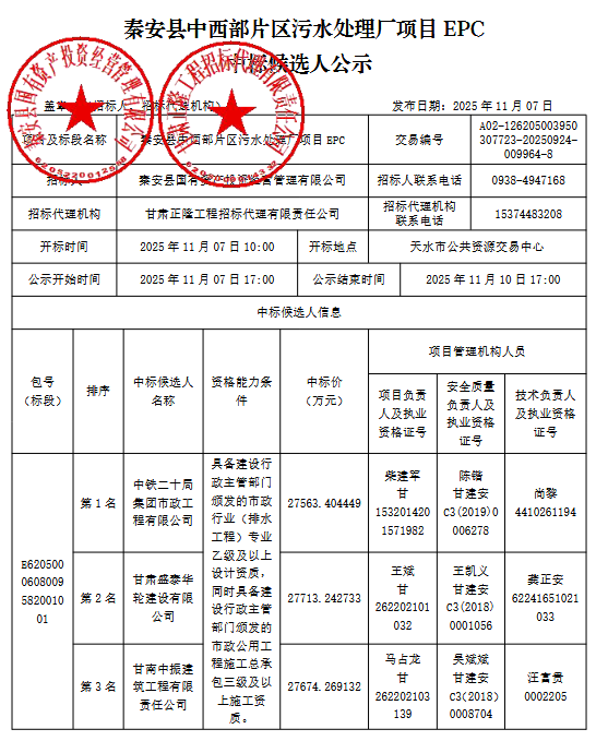 11月7日,甘肃省秦安县中西部片区污水处理厂项目EPC中标候选人公示。